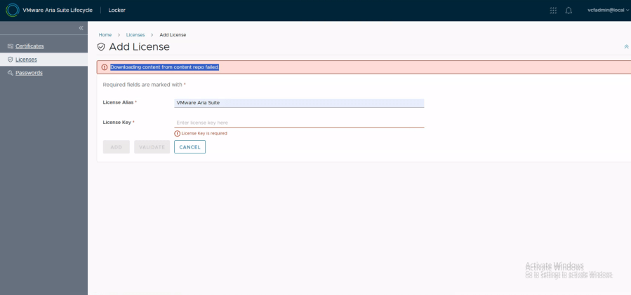 Probablemente vamos a poder solucionarlo como se indica en Downloading content from content repo failed.» Error when you try to Add License Manually from Aria Suite Lifecycle Locker y resumimos acá de la siguiente manera.
