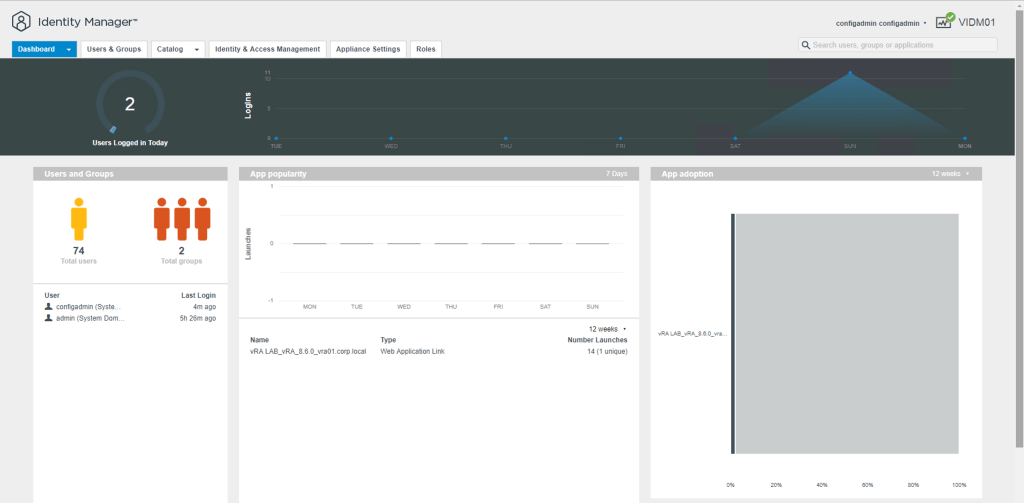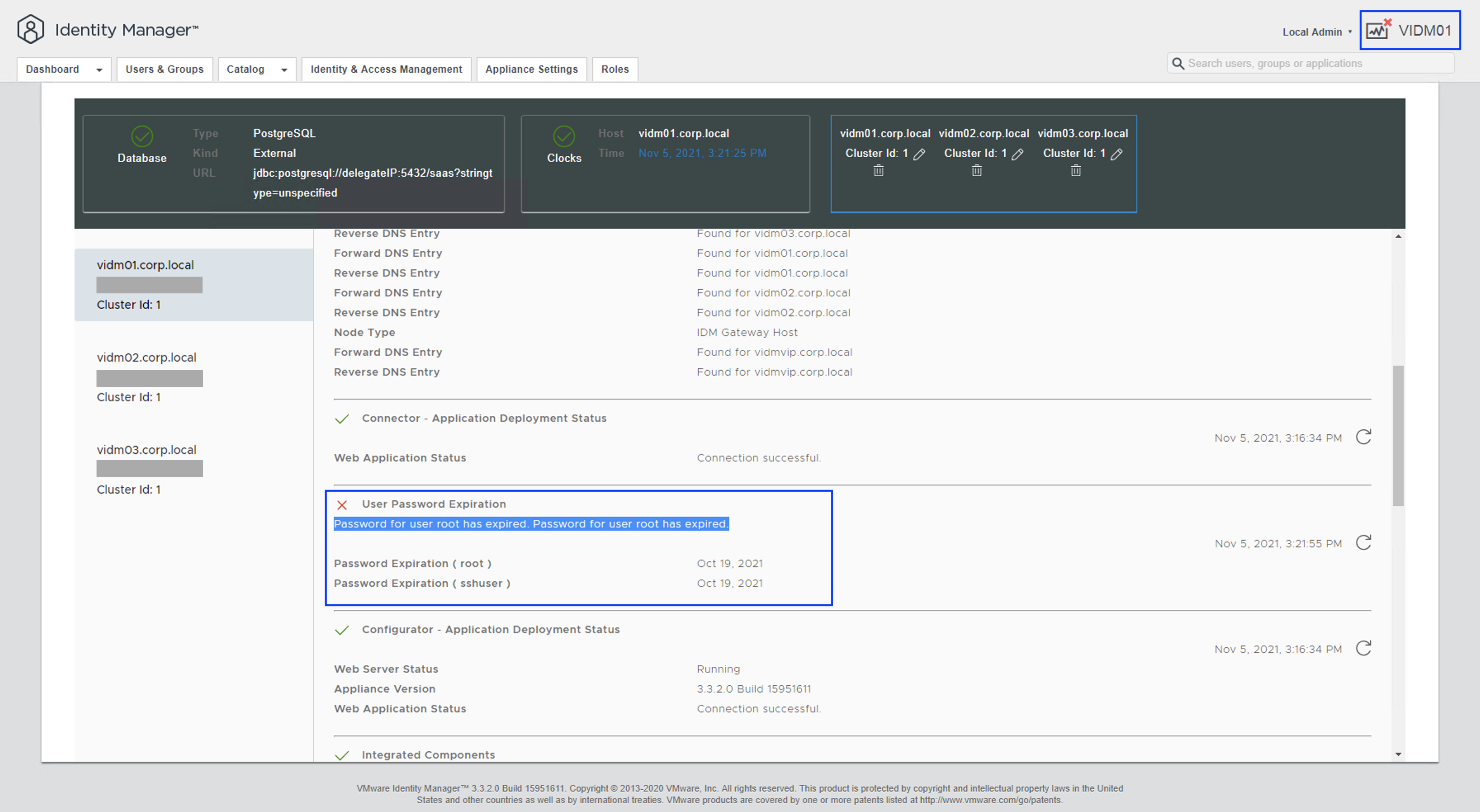 16. (Opcional) Cuando termine vamos a cada unos de los productos que estaba integrados con vIDM o WS1A, como por ejemplo Aria Operations (antes vRealize Operations Manager), Aria Automation (antes vRealize Automation), Aria Operations for Logs (vRealize Log Insight), etc. En algunas ocasiones podríamos necesitar hacer click Re-Trust with Identity Manager en cada una de las soluciones de Aria Suite (vRealize Suite), aunque este proceso por lo general se hace automático durante el reemplazo de certificados de Workspace One Access (WS1A).