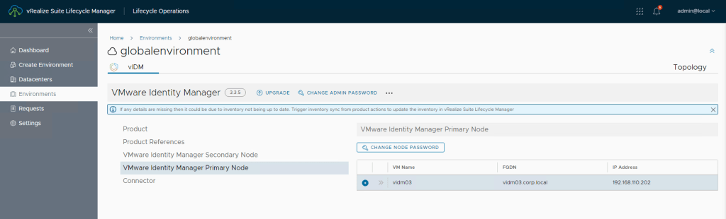 Nota 2: De igual forma, si se cambia el certificado del balanceador despues de cambiar el certificado de vIDM entonces recibirá una unas notificaciones en Aria Suite Lifecycle indicándole que debe realizar una acción de re-trust en cada una de las soluciones que se encuentren detras de ese balanceador. Comenzando de nuevo por Workspace One Access (WS1A).