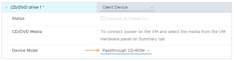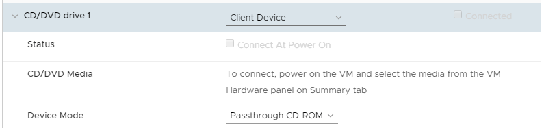6. (Opcional Recomendado). Haga clic con el botón derecho en editar la configuración, cambie la unidad de CD/DVD 1 a Client Device con el Device Mode en Passthrough CD-ROM.