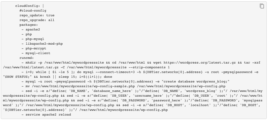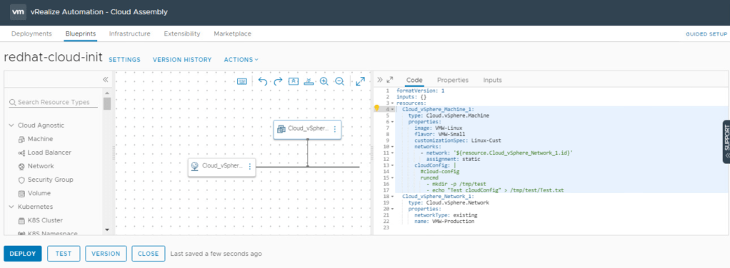 Para verificar el funcionamiento de los comandos cloud-init enviados a través del cloudConfig desde el Cloud Template, recomiendo crear un Cloud Template básico que cree un archivo test.txt en el repositorio /tmp/test.