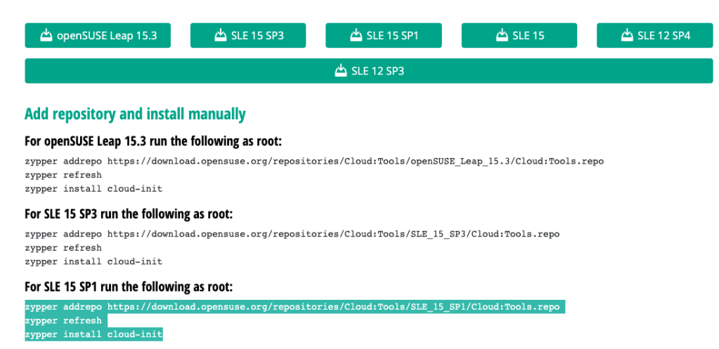 3. Una vez instalados todos lo paquetes listados anteriormente. Proceda a instalar el cloud-init como lo indica la documentación oficial de SUSE cloud-init from Cloud:Tools. De nuevo puede apoyarse de la web para buscar el comando correcto de acuerdo a su version de SUSE.