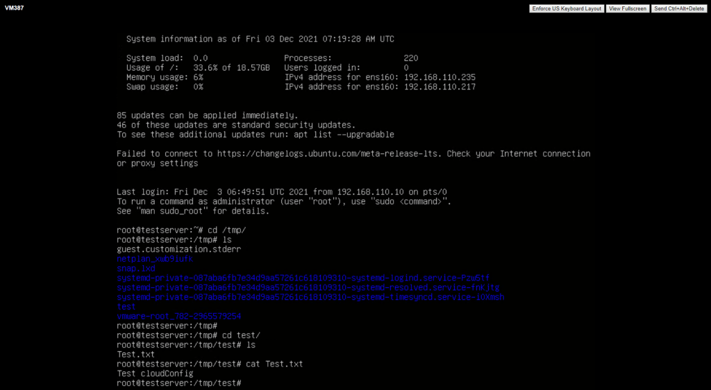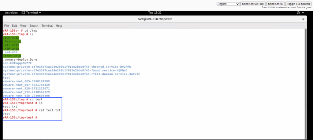 Ahora después de hacer un despliegue del Cloud Template (Blueprint) del ejemplo anterior (Ejemplo de utilización en Cloud Template (blueprint) con imagen RedHat/CentOS/Ubuntu) podremos ver que se ha creado la carpeta test y el archivo Test.txt dentro de la carpeta. Esto quiere decir que ya se están ejecutando los comandos cloudConfig enviados desde el Cloud Template de vRealize Automation.