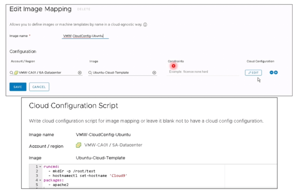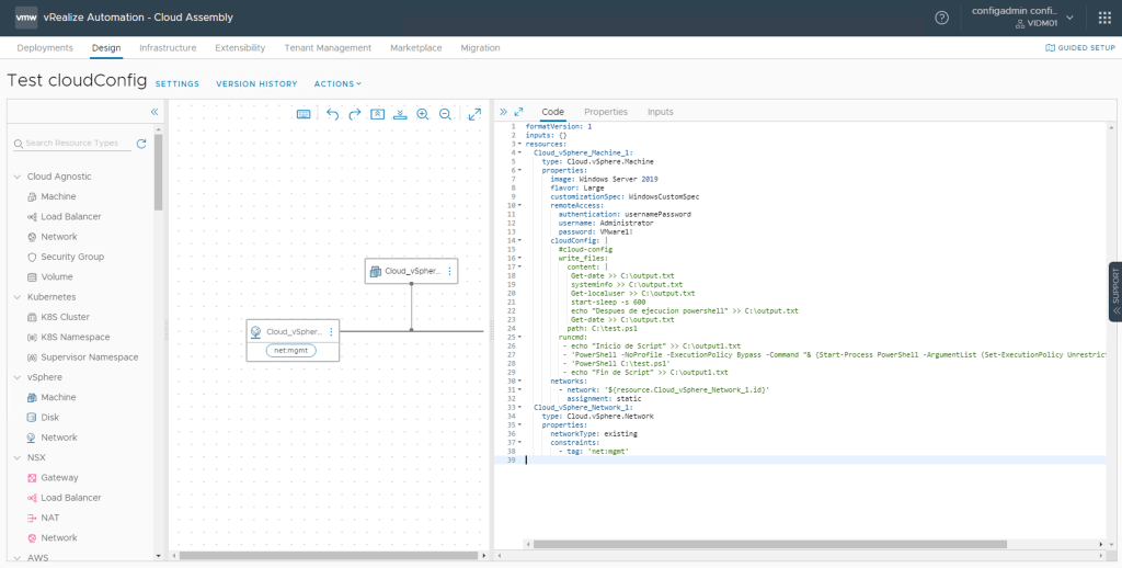 Nota 13: Cuando despliegue en vSphere, proceda con cuidado si intenta combinar los comandos integrados de cloudConfig con la utilización de Customization Specification de vSphere. No son formalmente compatibles y pueden producir resultados inconsistentes o no deseados cuando se usan juntos. Sin embargo, puede utilizarlos juntos de forma segura siempre y cuando NO utilice comandos de inicialización para la red en cloudConfig ya que esta acción la realiza el Customization Specification de vSphere. Recomiendo leer el siguiente enlace y revisar los ejemplos allí descritos para entender cómo interactúan los comandos y los Custom Specification. Revise los ejemplos para Asignación de direcciones IP estáticas en Cloud Templates de Cloud Assembly .