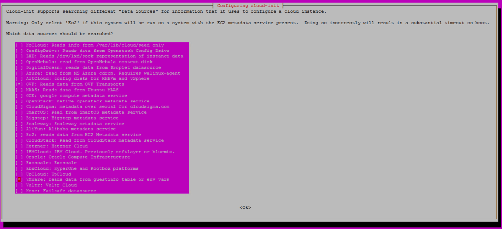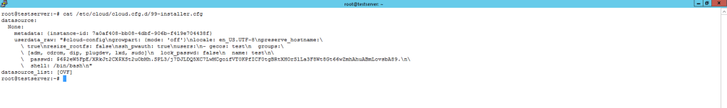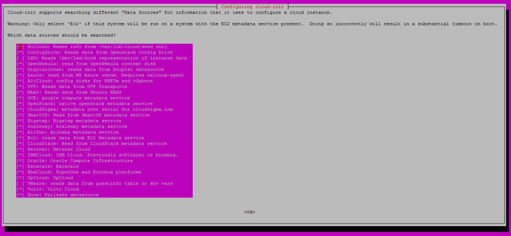Por otra parte, si como mencionamos antes el cloud-init ya esta instalado en SO, tener en cuenta que por defecto el cloud-init viene «desconfigurado». De manera que para esta version (Ubuntu 20.04) es importante verificar que tengamos configurada la fuente de datos (Data Source) correcta.