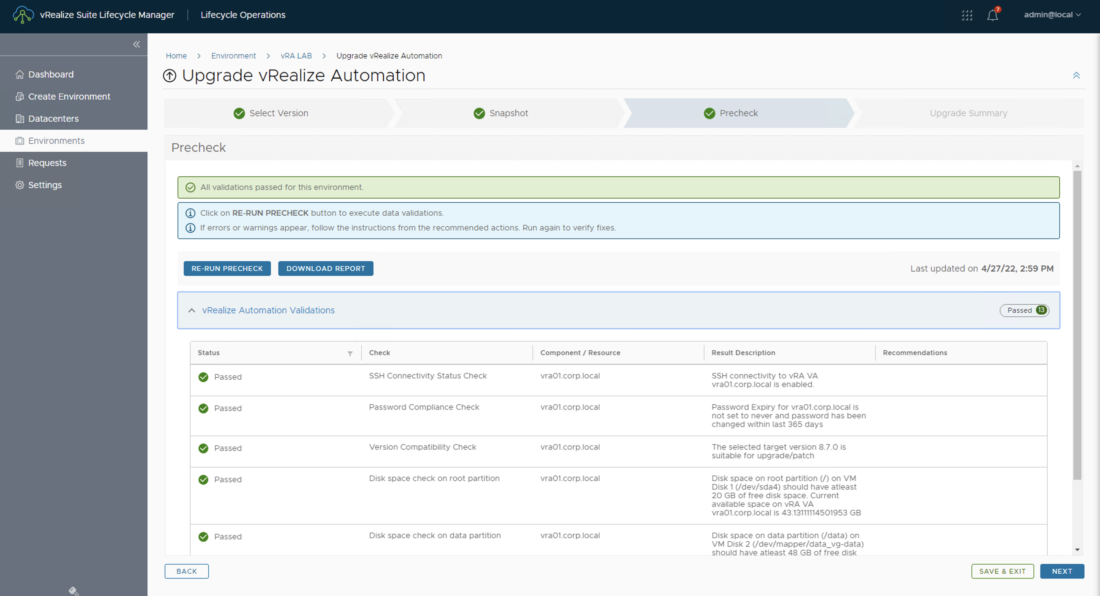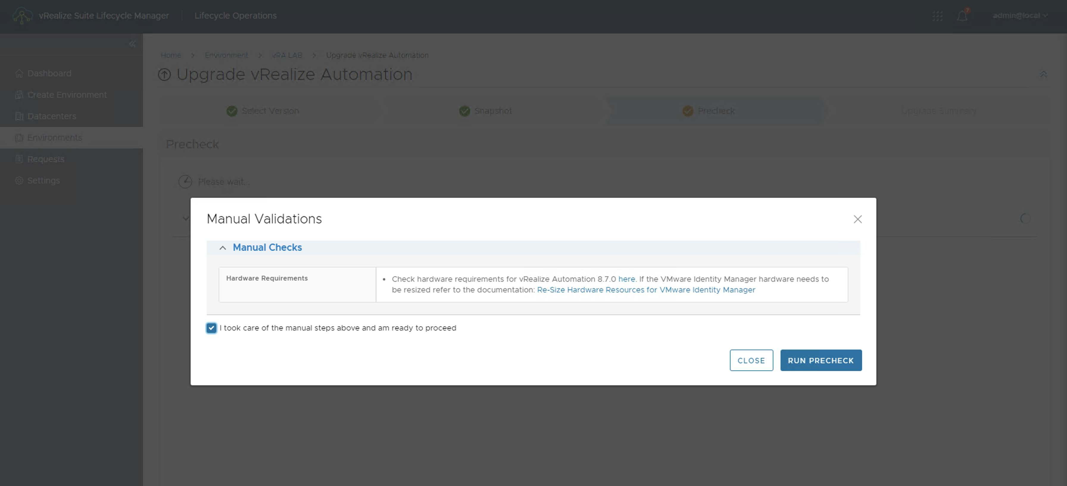 12. Para validar que el certificado que vamos a aplicar es correcto, debemos ejecutar un PRECHECK haciendo click en el botón RUN PRECHECK