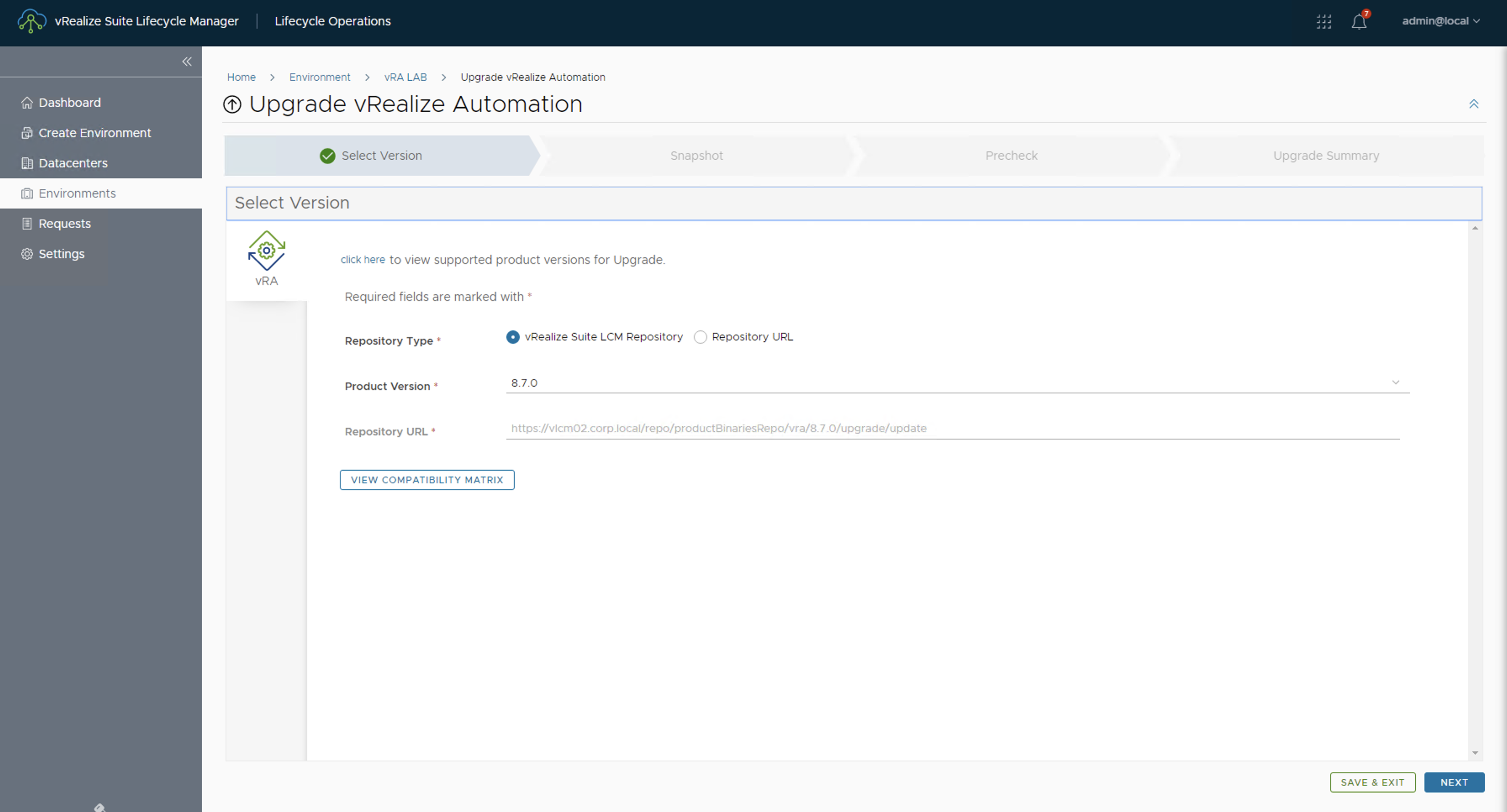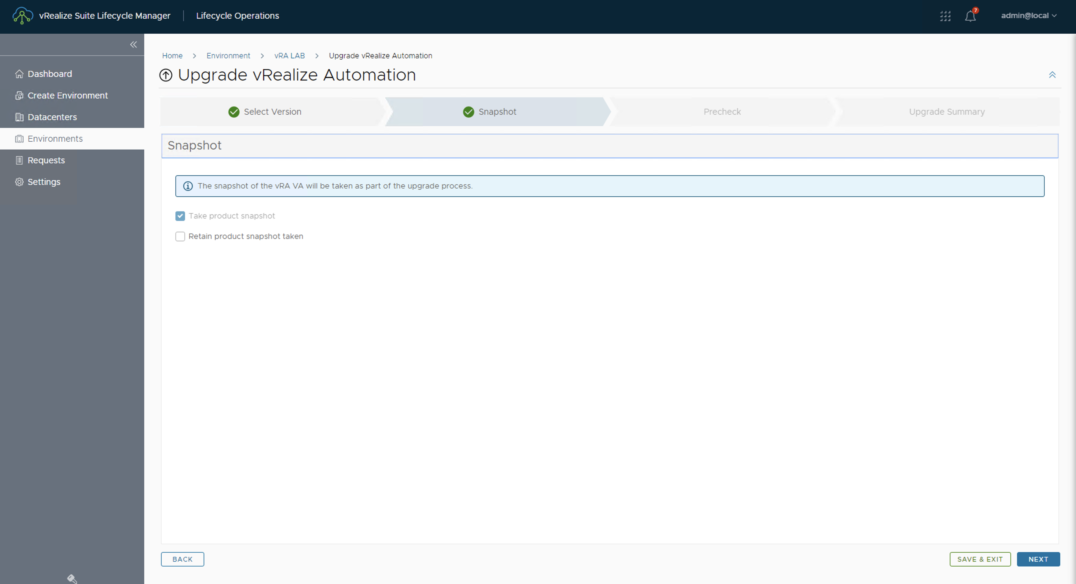 11. A continuación podremos seleccionar si queremos que Aria Suite Lifecycle cree por nosotros un snapshot en la VMs involucradas . Se recomienda esta acción a no ser que ya hayamos tomado un snapshot directamente desde el vCenter. Luego Click en NEXT