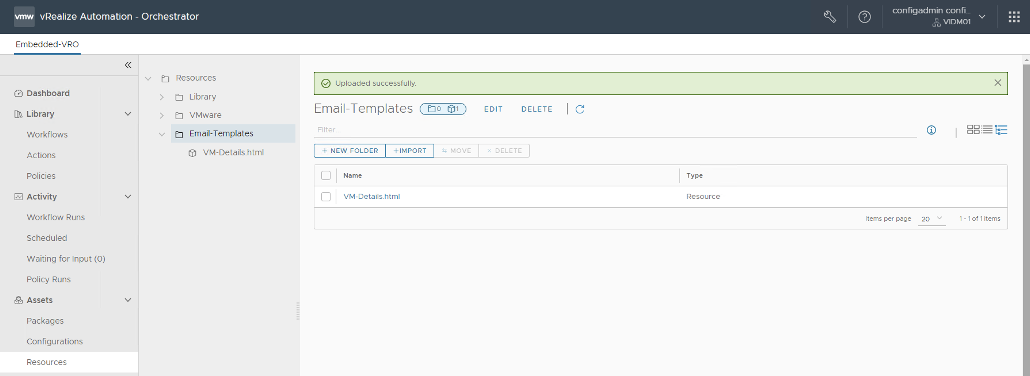 Como resultado del TEST CONNECTION recibiremos ademas un correo electrónico en la cuenta email configurada para el usuario con el cual estamos haciendo el TEST CONNECTION. Es decir, en este caso estamos logueados en Aria Automation con el usuario configadmin que es un usuario local de Workspace One Access, el cual tiene en su atributo email la cuenta de correo electrónico creada anteriormente.