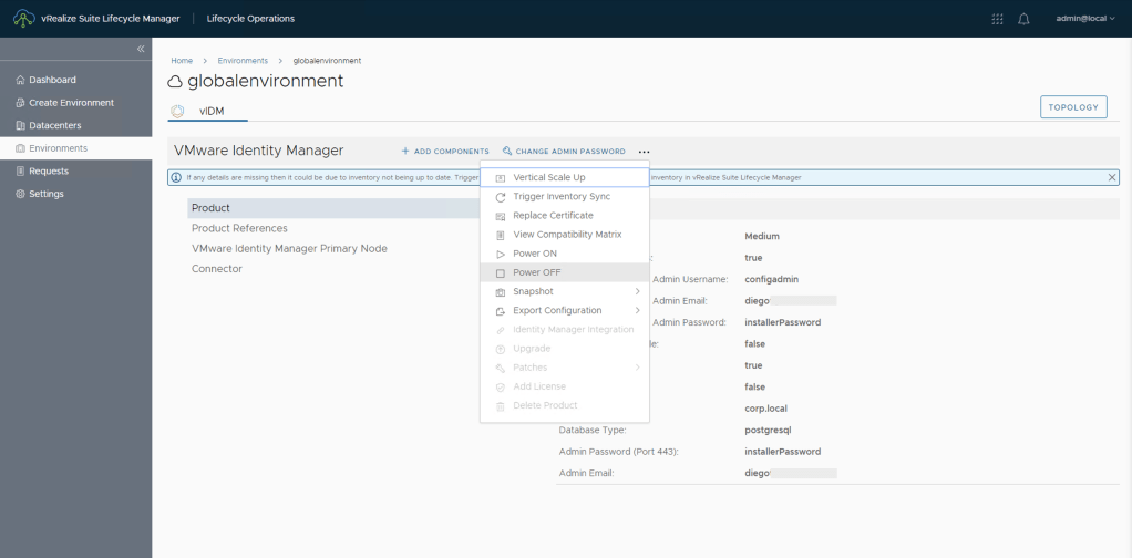 15. Como hemos realizado un cambio que esta por fuera del control de Aria Suite Lifecycle (vRealize Suite Lifecycle Manager) debemos realizar la acción de Re-trust Load Balancer, desde la solucion de Workspace One Access / VMware Identity Manager (globalenvironment) y para esto vamos a Environment -> global environment -> click en los tres puntos (…) para mas opciones y luego click en Re-trust Load Balancer