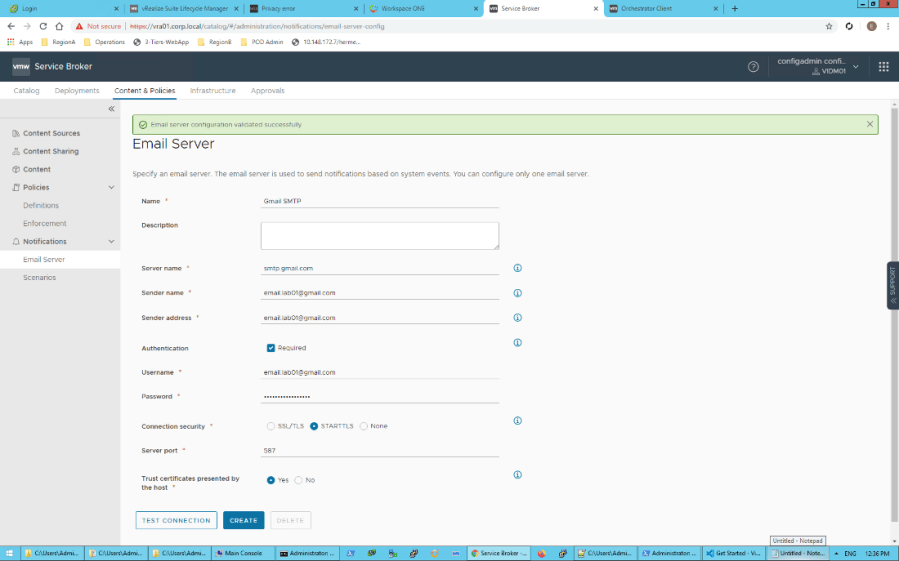 Server Name: smtp-mail.outlook.com Sender Name: Alias para el emisor de la notificación Sender Address: vmware.test.lab01@outlook.com (a diferencia de la configuración con Gmail esta si debe ser una cuenta válida) User Name: vmware.test.lab01@outlook.com (cuenta de email creada) Password:jhsdcpumigurzfgg (La contraseña de aplicaciones creada en el paso anterior) Connection Security: STARTLS Server port: 587 Trust certificates presented by the host: Yes