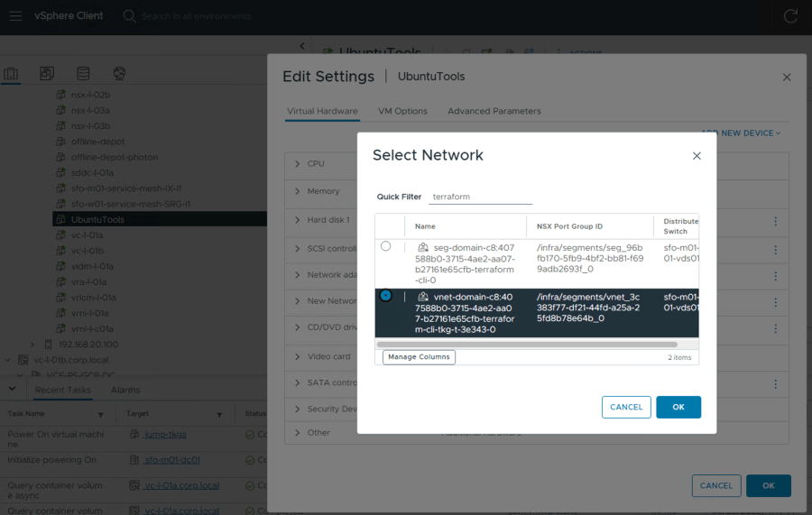 Nota: Recordemos que las IPs que ha tomado las Control VM y Worker nodes de TKG son del Segmento vnet-domain-xxxxxx-Namespace-Name-yyy. Por esta razon debemos conectar ese Segmento NSX a nuestra VM en la segunda interface.