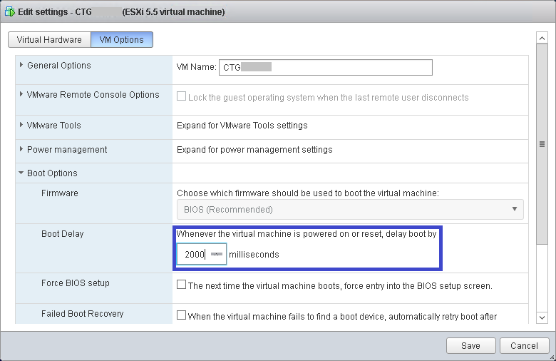 1. Edite la configuración de la máquina virtual asociada a vSphere Replication, haciendo click derecho –>Edit settings –>VM Options. Adicione un tiempo de retardo en milisegundos en Boot Delay para tener tiempo de ejecutar el menú GRUB (GRand Unified Bootloader), el cual es un gestor de arranque múltiple que permite elegir el sistema operativo a iniciar
